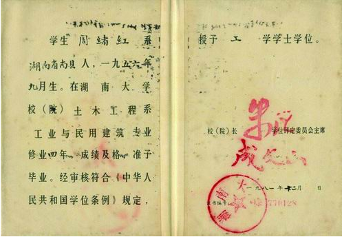 周绪红的学士学位证书