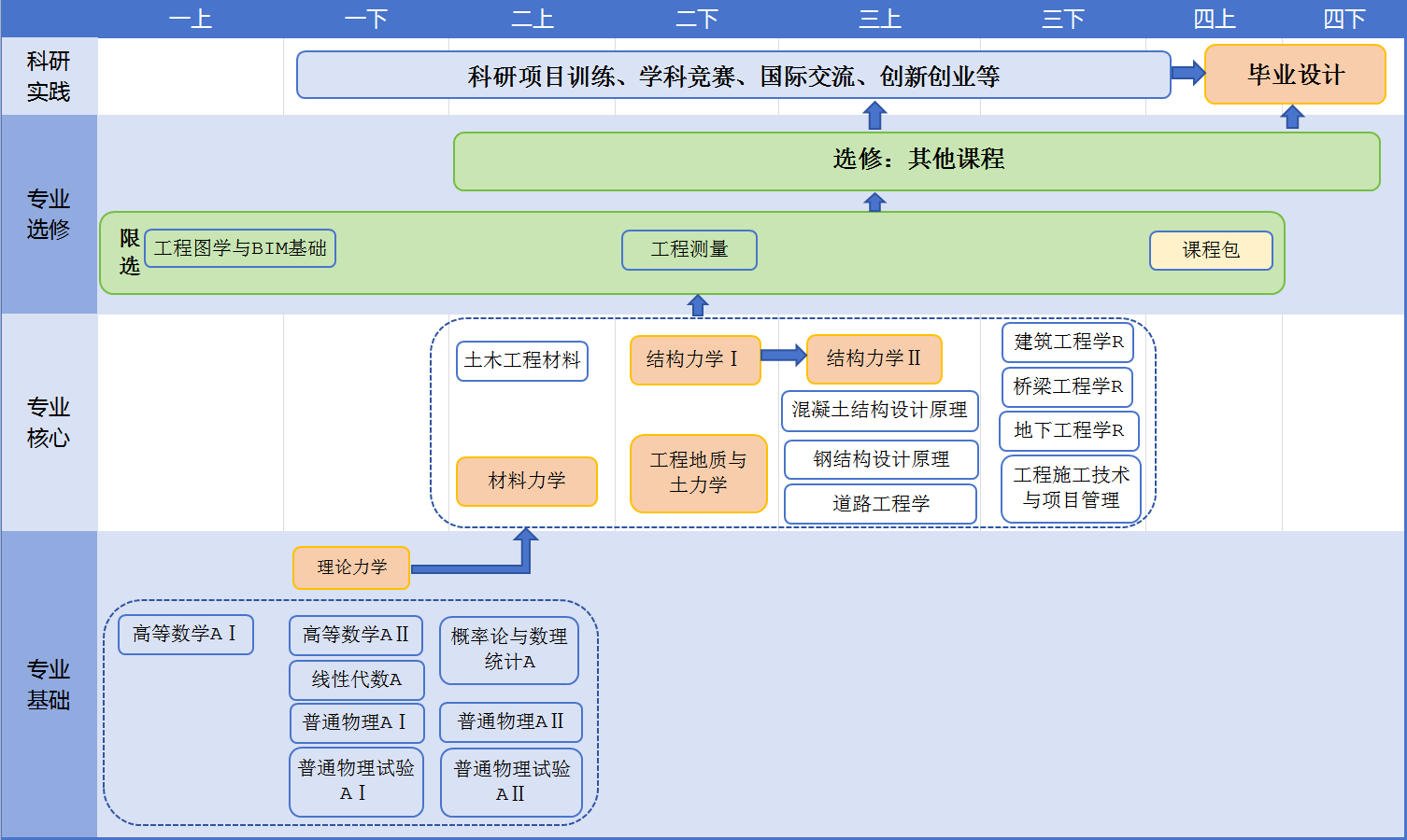 7. 课程包A~E课程:作为毕业设计的先修课程包,对应建筑工程、地下工程、道路工程、桥梁工程和建筑材料各方向或毕业设计方向,每个课程包为5学分,其中2门能力方向课和1门毕业设计基础课程。学生必须选择其中一个课程包,并修完包内所有课程。