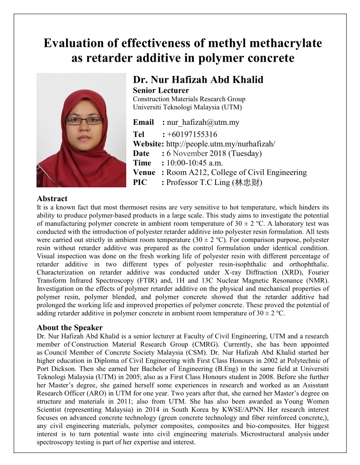 Dr. Nur Hafizah Abd Khalid:甲基丙烯酸甲酯作为缓凝剂在聚合物混凝土中的有效性评价