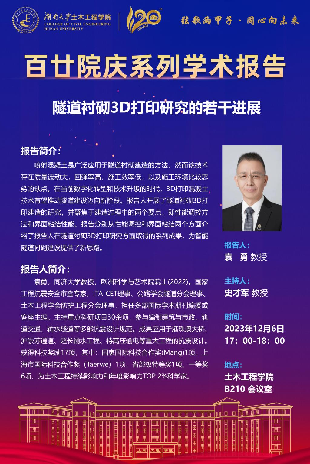 百廿院庆 学术活动|袁勇:隧道衬砌3D打印研究的若干进展