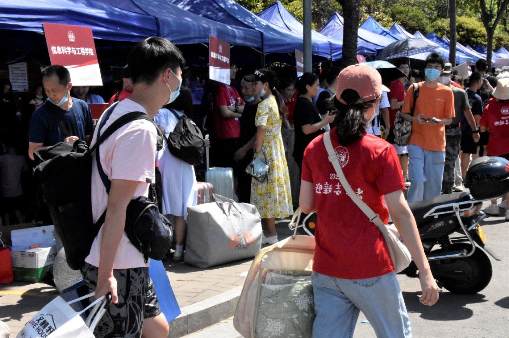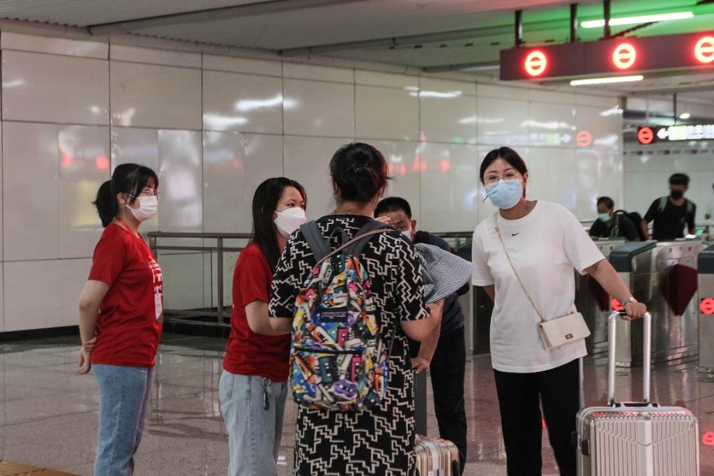 在地铁出站口同样也有一群红衣青年迎新志愿者接待刚下地铁的新生和家长,并指引他们到达宿舍区。