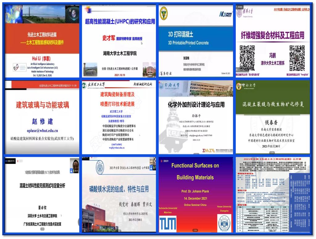 等九所高校共同组织,全国三十余所高校协助举办,公开课同时得到了《硅酸盐学报》、《混凝土与水泥制品》、中国建筑科技出版社“谈材说料”、建设科技直播等多家单位大力支持。公开课邀请了十一位国内外著名的建筑材料与土木工程领域专家进行授课,内容涵盖了高性能水泥基材料、3D打印混凝土、功能材料、建筑陶瓷和玻璃、生物矿化材料以及外加剂等多个研究领域,旨在向在校研究生和青年教师介绍土木工程材料领域的前沿理论和技术成果,激发广大青年学子对土木工程材料的研究兴趣。