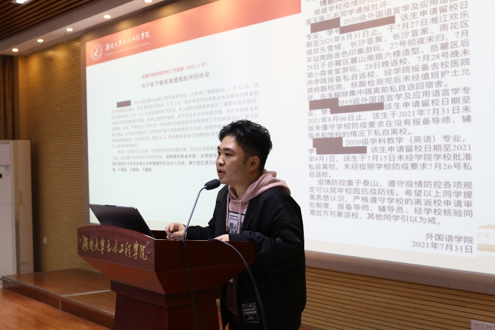 秦鹏针对目前严峻的疫情防控形势,指出高校在疫情防控工作中的特殊性、重要性,强调全院研究生要提高责任意识,做到疫情防控人人有责。考虑到湖大校园的特点,各级学生干部与研究生党员要坚守底线思维,以高度的警觉保持疫情防控常态化建设,发挥学生干部与党员的模范带头作用,不忘初心使命,做好疫情防控常态化工作。