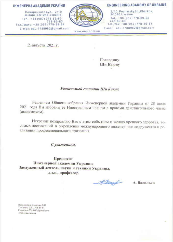 史才军教授发来贺信,祝贺他当选乌克兰国家工程院外籍院士。
