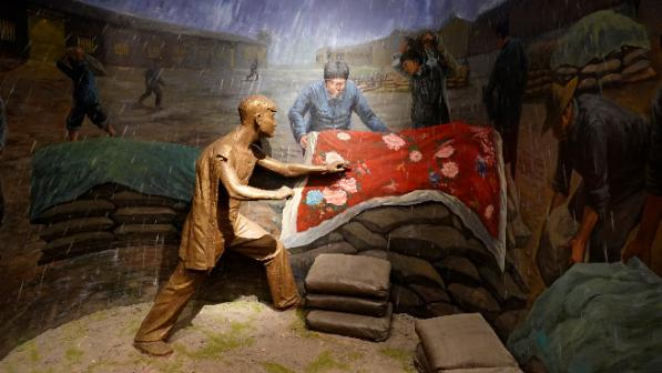 图4:雷锋同志的奖状及雷锋同志在暴雨中抢救水泥的场景