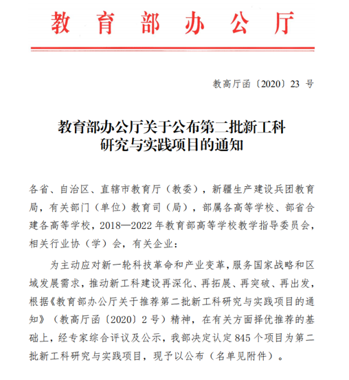 新工科建设是主动应对新工业革命、推动高等教育变革的先手棋,既要立足当前主动作为,更要面向未来主动谋划,加快推动我国由“教育大国”向“教育强国”转变。新工科项目是指为应对新一轮科技革命和产业变革的挑战,主动服务国家创新驱动发展和“一带一路”“中国制造2025”“互联网+”等重大战略实施,加快工程教育改革创新,培养造就一大批多样化、创新型卓越工程科技人才,支撑产业转型升级等实施的国家级新工科研究与实践项目。新工科项目也是卓越计划的升级版(简称“卓越计划2.0”)。新工科项目每两年申报认定一次,其中第一批于2018年1月22日公布,全国共612项获得认定,本次(即第二批)全国认定项目为845个。