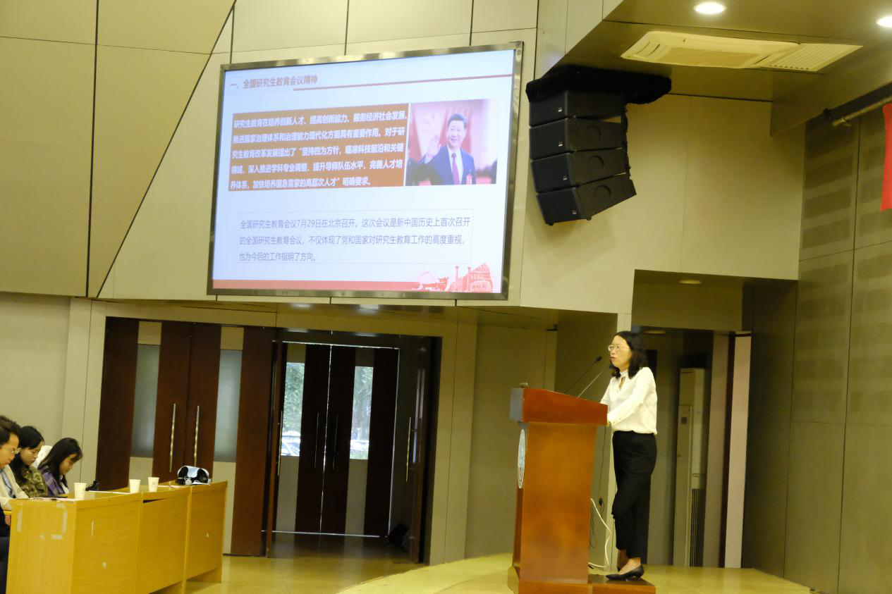 研究生招生简况和学科排名动态,并对研究生工作部的设立、工作职能及重要性做了详尽介绍。她强调研工部聚焦“怎么做、谁来做、做什么、怎么想”四个问题,大力推进立德树人研究生工作队伍建设,完善教育协调机制,更好的开展研究生教育管理工作。最后她引用习总书记的话,勉励同学们练就过硬本领,投身强国伟业。
