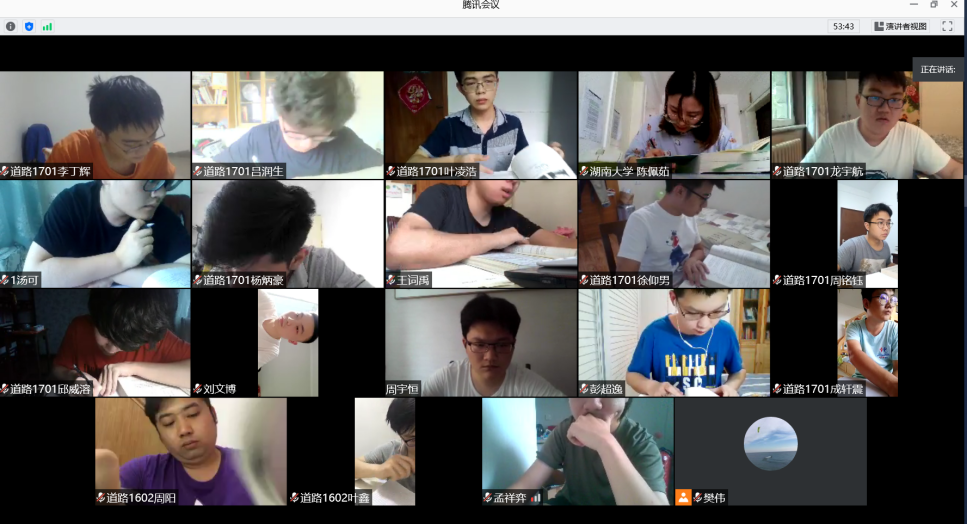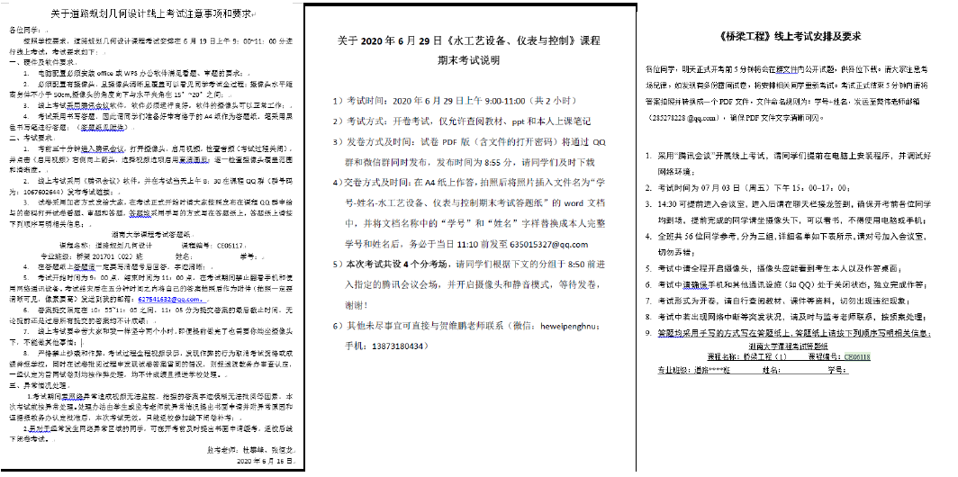 自此,在顺利完成这场考试之后,各门课程考试按照考试安排表有序开展......6月29日,建工系张望喜教授在《混凝土及砌体房屋结构设计》考试前,将1703、1704班分为了三个临时班,防止软件卡顿和信号异常等,为了让学生适应网络考试对考试过程做了一次预演,提前5分钟发放试卷避免占用学生作答时间。考试前3天,他还把专用答题纸文档发给学生,让有条件的学生提前打印好,在专用答题纸上作答,答题完成后,由学生拍照或扫描制作成PDF文件上传到提前告知的专用邮箱。要求学生打开视频并闭音频,并按要求调整好摄像头位置和角度,保证监控画面可以看到学生的作答纸面。试卷通过“腾讯视频”上的共享文档发放,并同步“QQ授课群”内发放,每位学生可按自己最合适的方式获取和使用试卷。考试过程中提醒学生剩余时间2次。考试时间到,提醒学生最后检查学号姓名,并按照提前演练过的方法制作PDF提交。