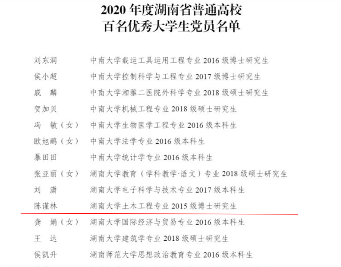 2015级博士研究生陈谨林为“湖南省优秀大学生党员”(全校获评五位)。