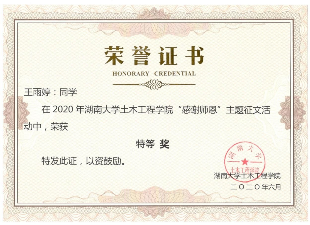 工程应用力学研究中心党支部为深入调查和了解学生学习情况,从学生的角度审视教师的教学效果,于5月19日举办了“感谢师恩”主题征文活动,在20天时间里,共收到54份学生来稿。由工程应用力学研究中心支部委员会、学生工作办公室组成的评审委员会对54份作品进行了评选,评选出了特等奖一名、一等奖三名、二等奖五名和三等奖十名。