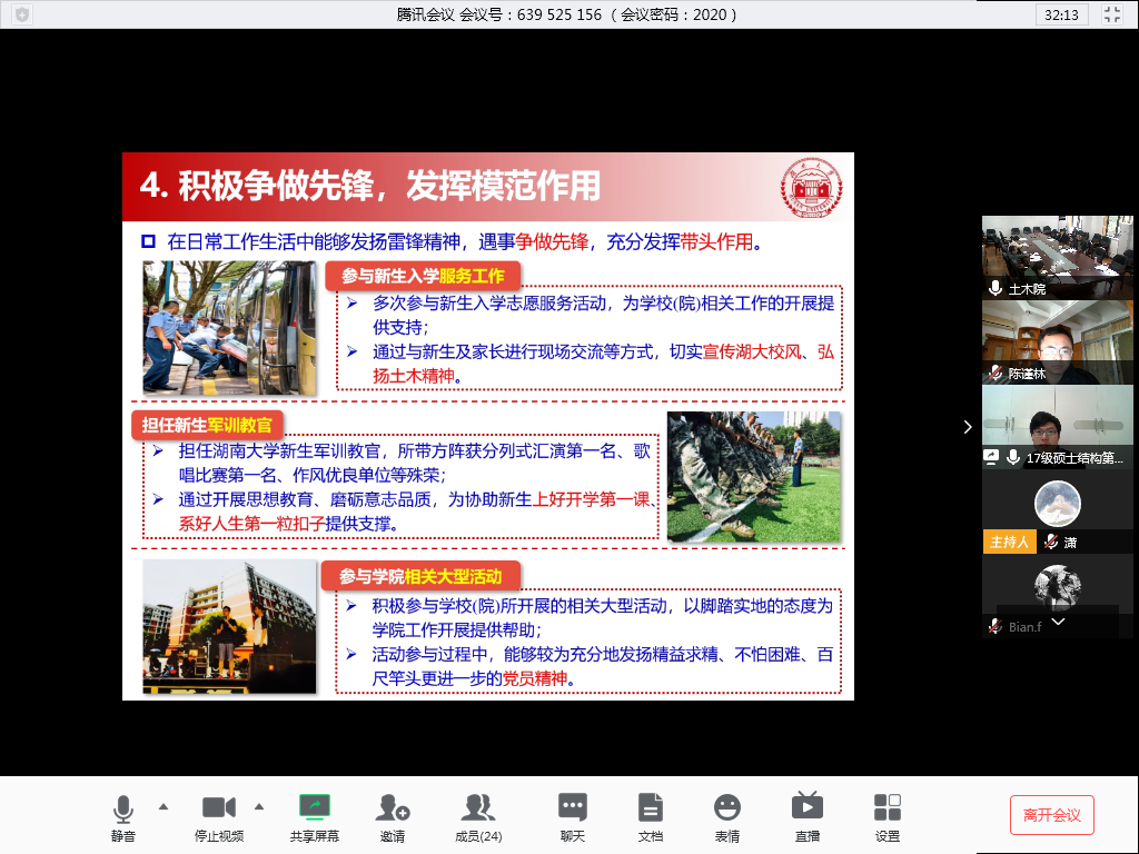优秀学生党员、湖南省普通高校优秀大学生党员评选和推荐工作。本次答辩通过视频会议的方式,经党员自述、评委提问两个环节,从各党支部推选出的15位学生党员中选出9名校优秀大学生党员候选人、2名省普通高校优秀大学生党员推荐人选。