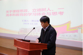 黄立葵首先作了“课程思政”的专题介绍,他以“关于课程思政、立德树人、一流本科教育的学习体会与思考”为题,介绍了学院开展课程思政工作的基本情况,分析了课程思政、立德树人与一流本科建设的密切联系,结合学院一流专业建设、金课建设及教材建设等方面任务,强调了加强课程思政研究、经验交流和示范工作,鼓励全院教师为学院一流学科建设作出积极的贡献。