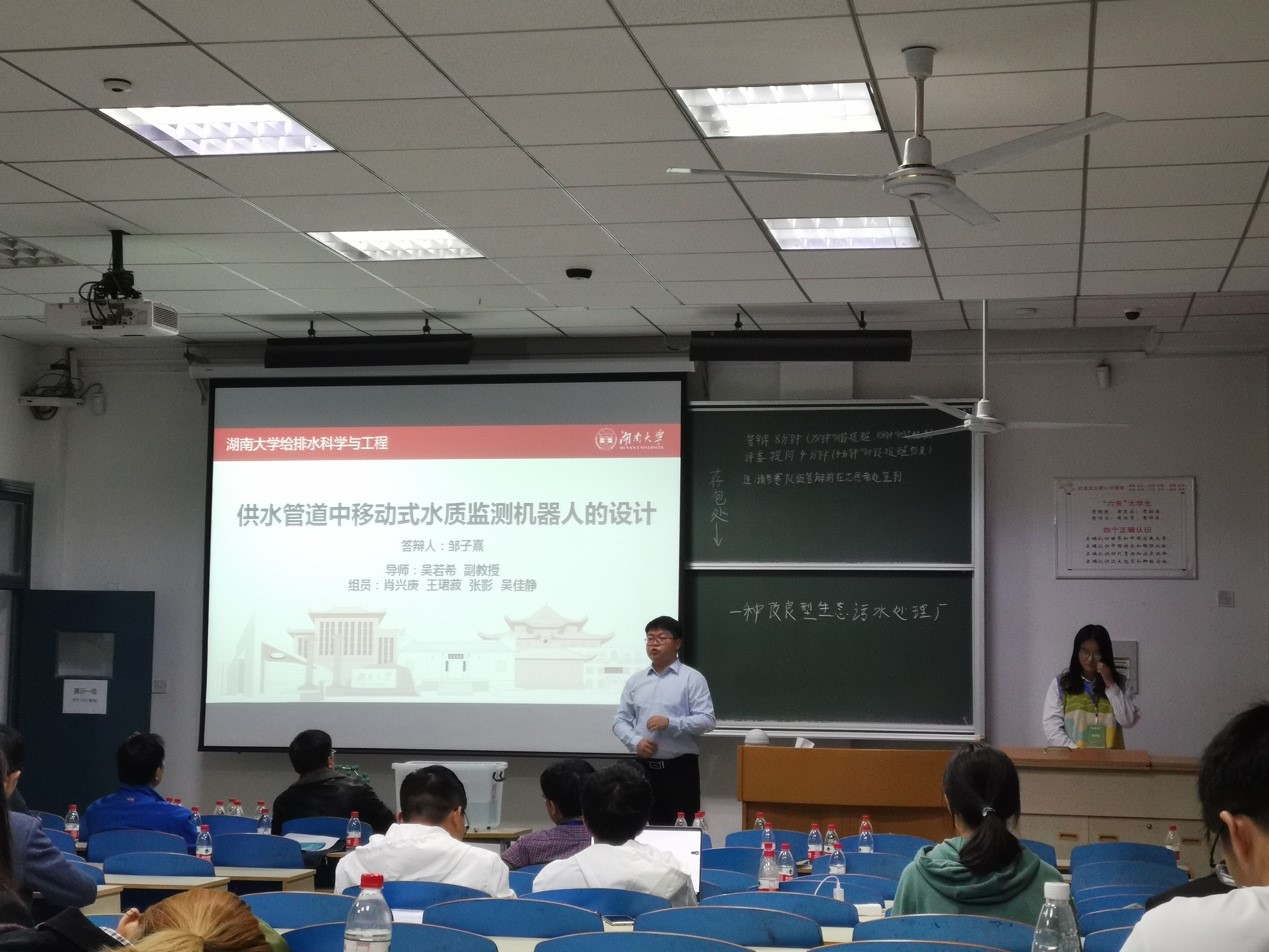 二队的参赛项目是《供水管道中移动式水质监测机器人的设计》,吴若希副教授和柳斌助理教授为指导老师,由邹子熹担任队长,成员包括肖兴庚、王珺菽、张影、吴佳静。设计的移动式管道机器人可以在管网中移动,从而较快速地获取大量的采样数据点。还可以结合新型的电化学传感技术、听漏技术、微流装置、无线信号传输技术和大容量电池,将管网中的水质水压数据从一个个采样点提升到整条管线的实时水情。这种移动式管道机器人的应用预期可以大幅提升对水量漏损和水质污染的响应时间,也为管网水力水质模型分析提供大量数据。该项目的现场展示吸引了多位专家的兴趣,最终获得团体二等奖。