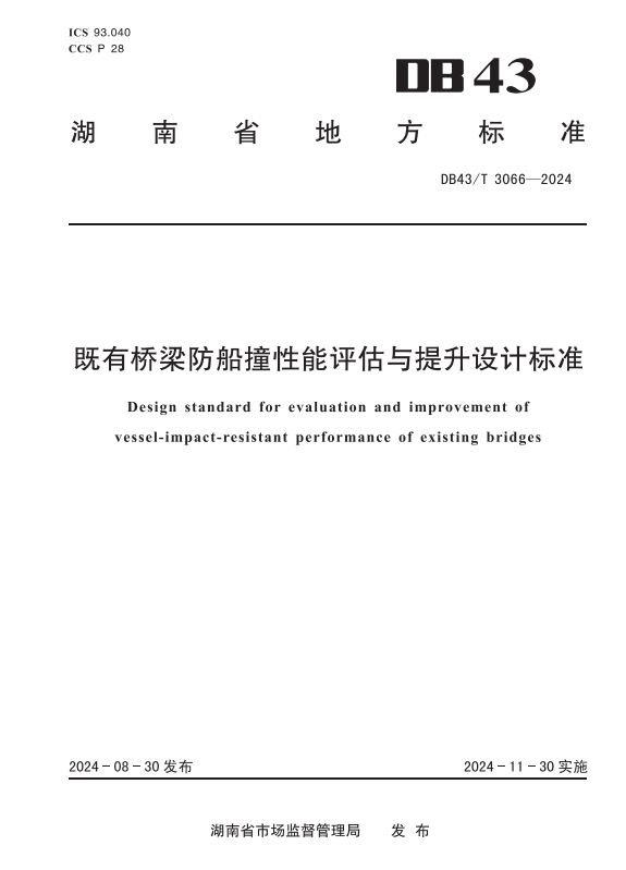 11月30日,学院樊伟教授团队与湖南省交通规划勘察设计院有限公司等合作主编的《既有桥梁防船撞性能评估与提升设计标准》(DB43/T 3066-2024)正式发布实施。