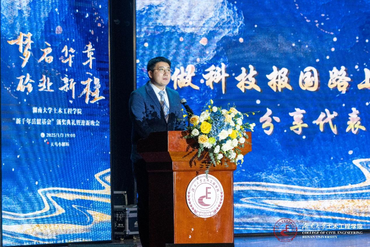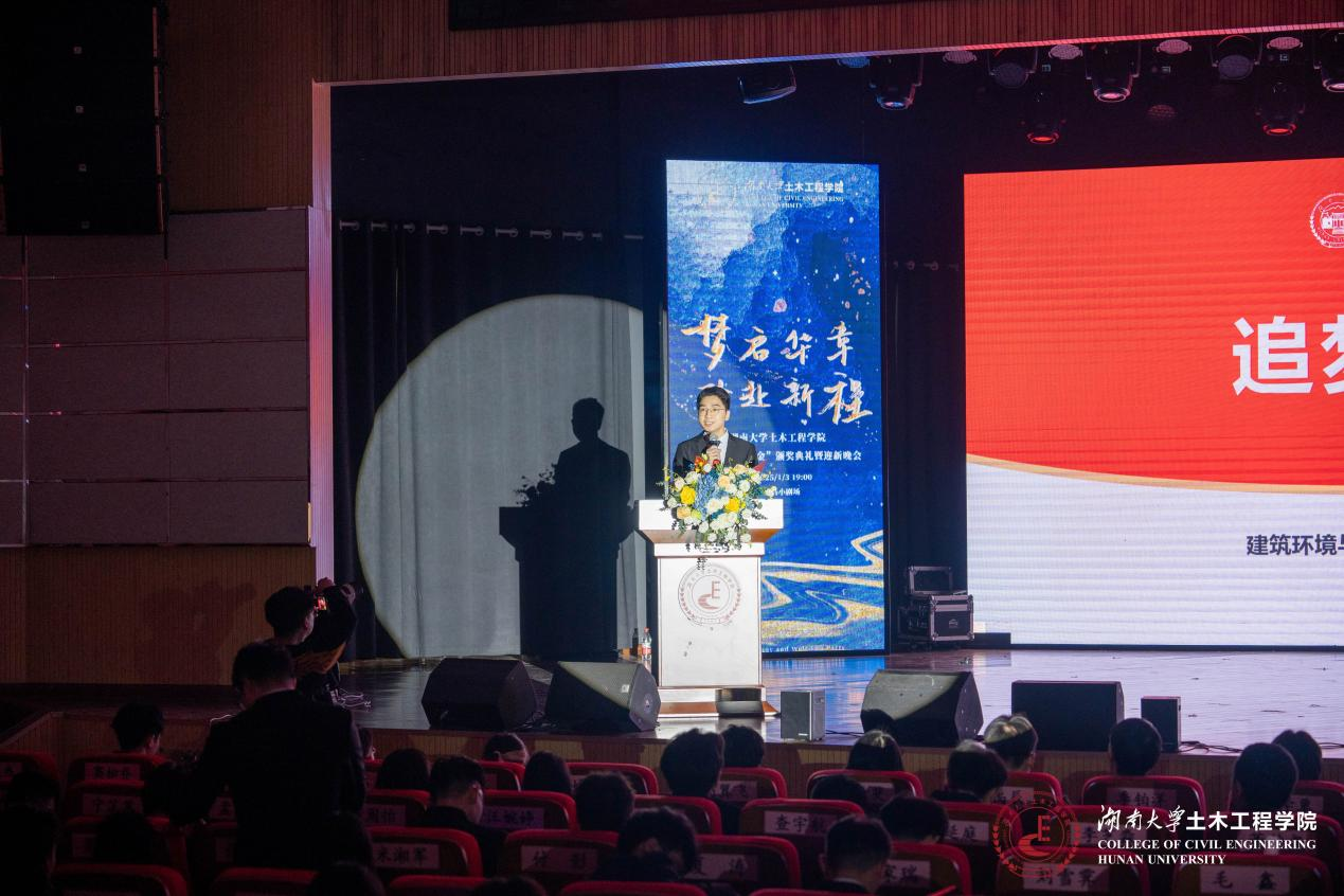 广州校友会常务理事李天兵作为设奖方代表分享设立“姜乃昌奖学金”背后的故事,他表示希望湖大土木人在未来机遇与挑战并存的浪潮中勇立潮头。“2004 级奖学金”获得者、本科生代表陈鹤一以“追梦青春”为题讲述大学成长故事,顺天综合奖学金”获得者、研究生代表张吉仁分享科研路上与 “风” 较量的历程,他们的故事激励大家脚踏实地、厚积薄发,争做时代 “驭风者”。