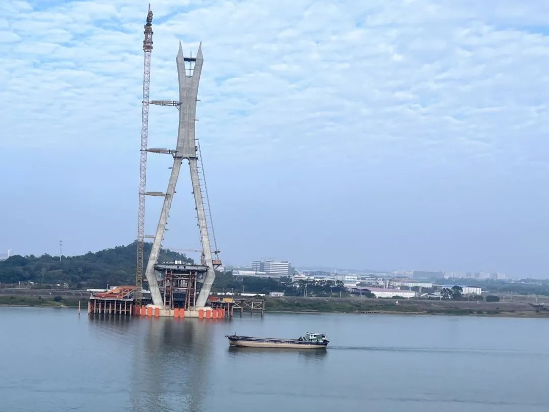 师生参观了施工中的广东佛山富龙西江特大桥,该桥为主跨580m的双塔双索面混合梁斜拉桥,桥梁全长1070m,其中,主跨及次边跨主梁采用了新颖的钢-UHPC组合梁结构。