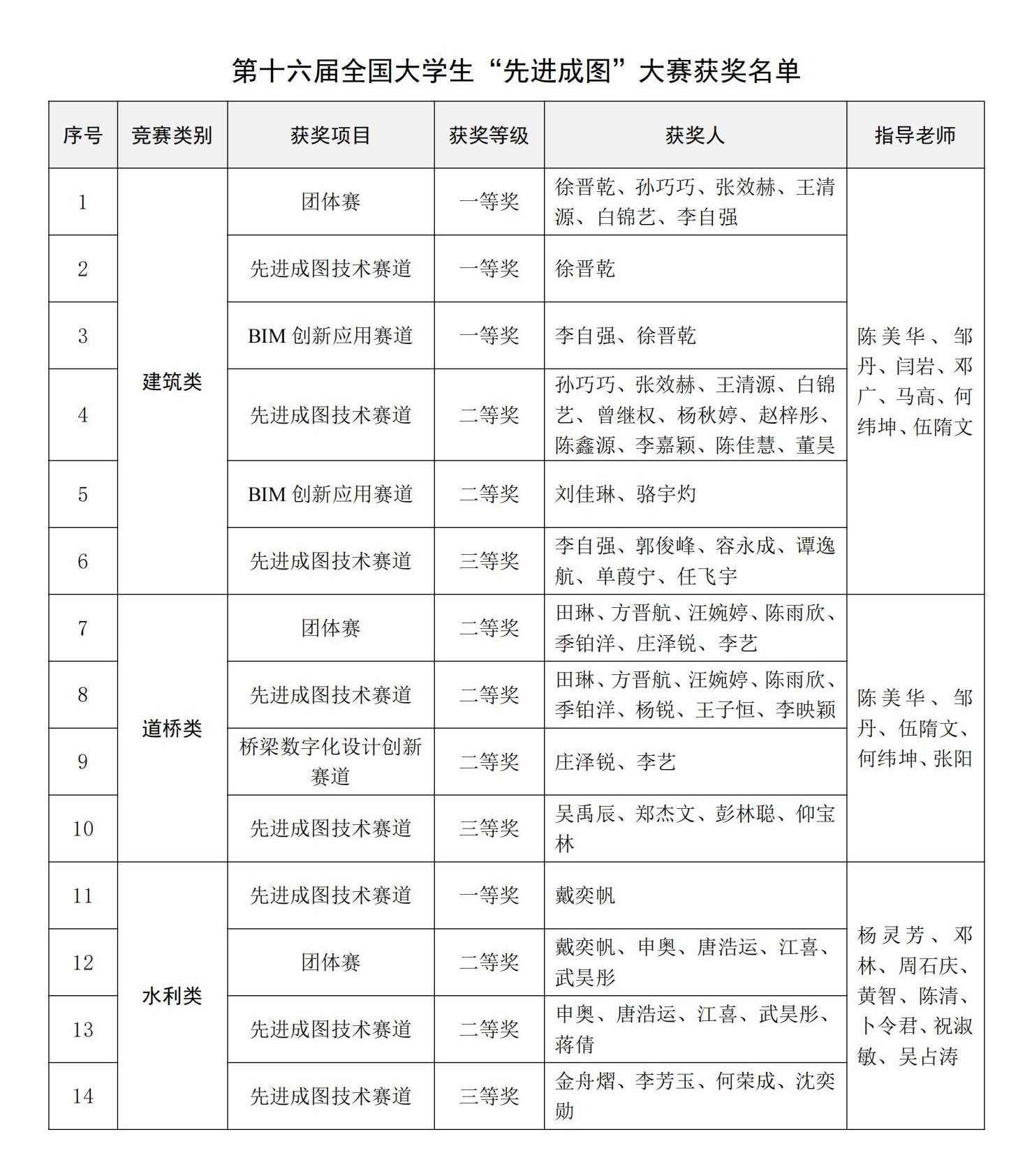 、建筑与规划学院和现代工程训练中心教师团队指导的学生队伍在建筑类、道桥类和水利类三个类别的竞赛中再创佳绩,荣获团体赛一等奖1项、二等奖2项,分赛道或个人赛一等奖3项、二等奖26项、三等奖14项,其中建筑类参赛团队已连续三年在此项赛事中荣获团体赛一等奖。
