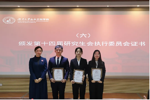 党委副书记曾欢欢老师、团委副书记丛珊珊老师为第十四届研究生会执行委员会委员颁发证书并合影留念。